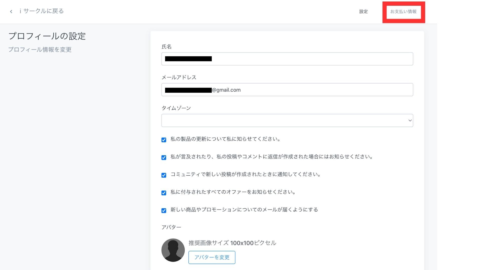 ①iサークルにログインし、右上のアイコンから「設定」をクリック